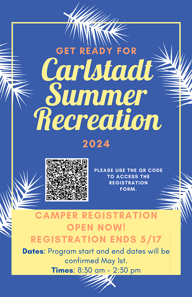 Camper registration for Carlstadt’s 2024 Summer Recreation is now open. Program start and end dates will be confirmed by May 1st.